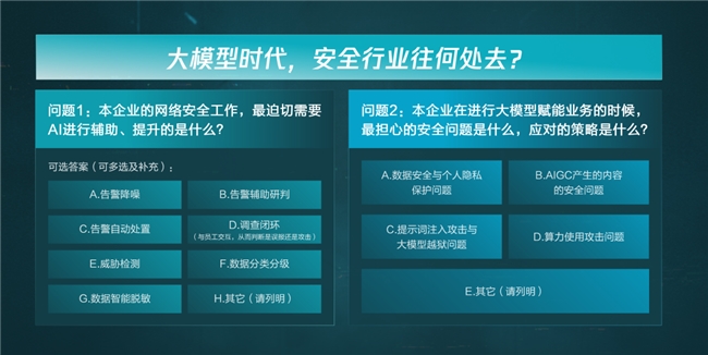 第三组代表炼石网络创始人&CEO 白小勇表示,对于第一个问题我们认为最迫切需要 AI 辅助的是D、F、H(调查闭环、数据分类分级以及编写报告)。企业在提升网络安全工作中,首先应评估哪些环节消耗大量的人工和成本,并选择合适的大模型来实现增效降本。而对于前三个和告警相关的选项,我们选择了 B(告警辅助研判)。此外,我们认为文档撰写也是企业的一个迫切需求,占比应该超过 50%。